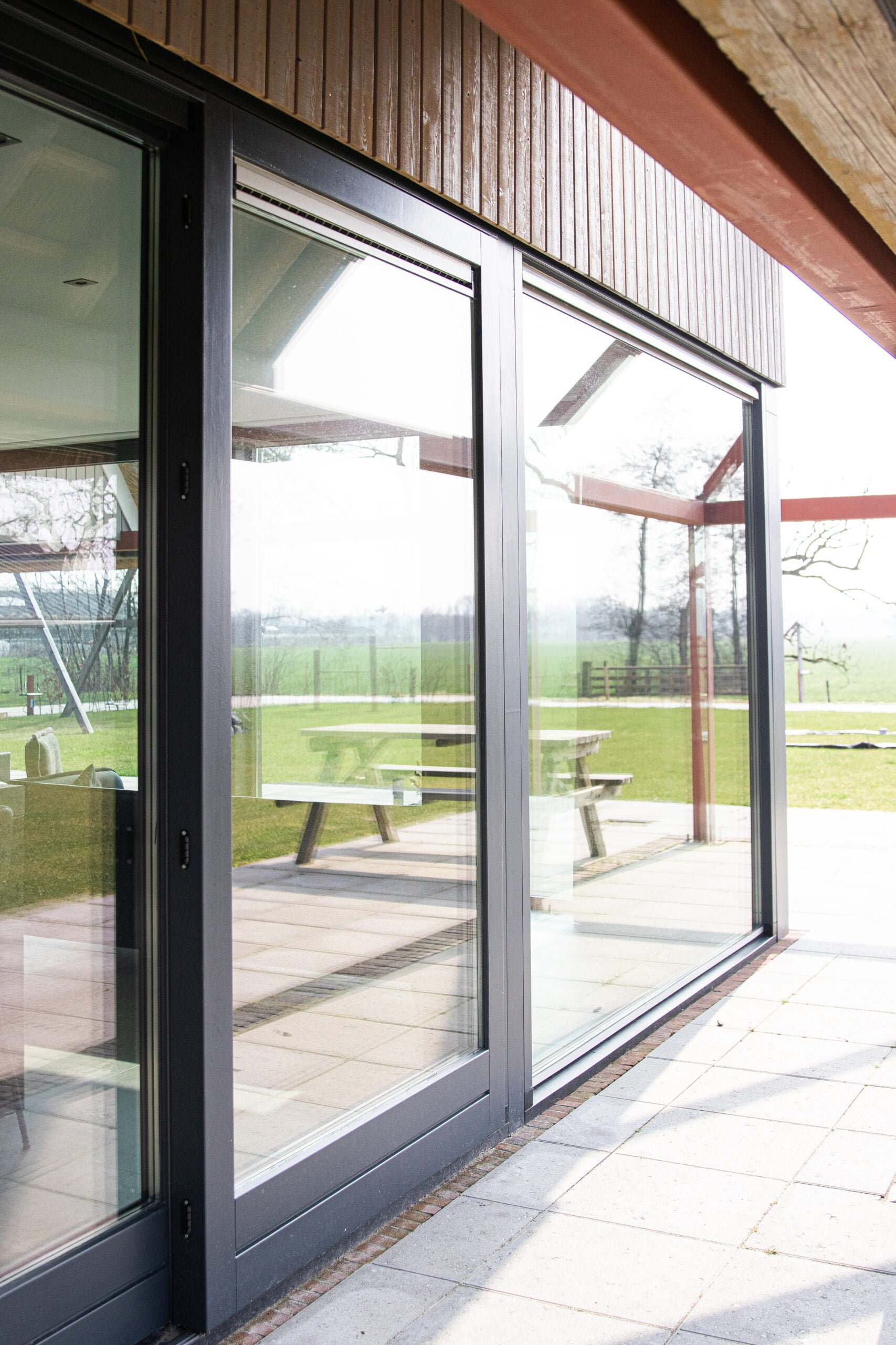 Onze houten schuifpuien met het Mahonie en Finti kozijnprofiel zijn voorzien van een glasvezel versterkte EasyEnt onderdorpel die bestand is tegen invloeden van buitenaf.
